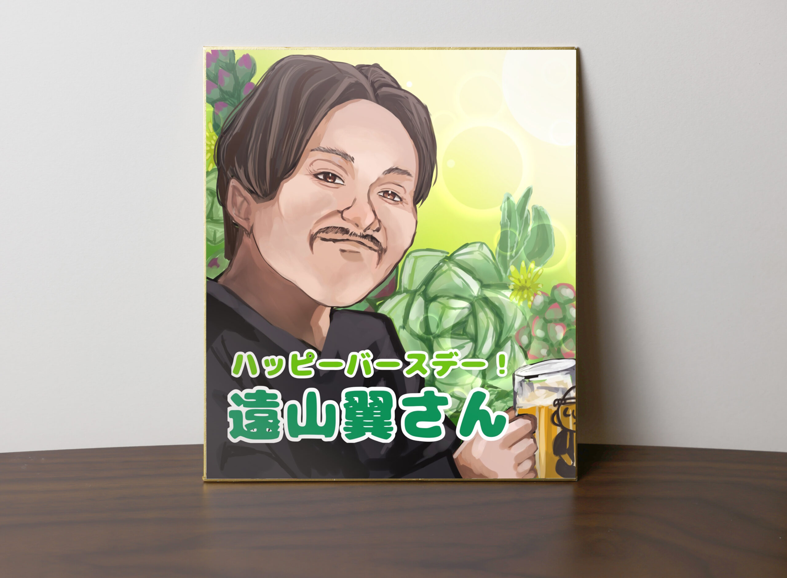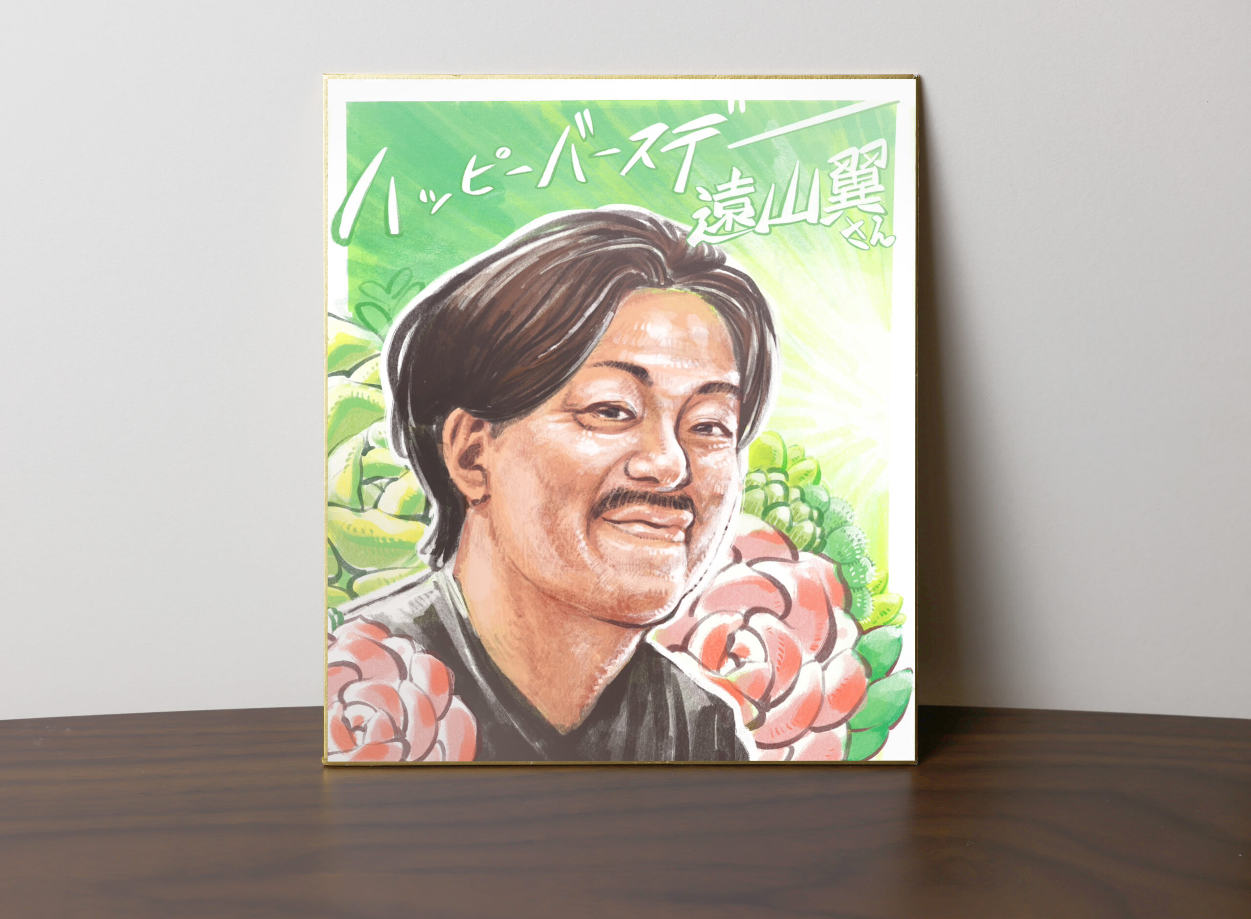 | ご要望内容 | ダンディーな笑顔を記念に色紙イラストにしたいというご希望でした。 |